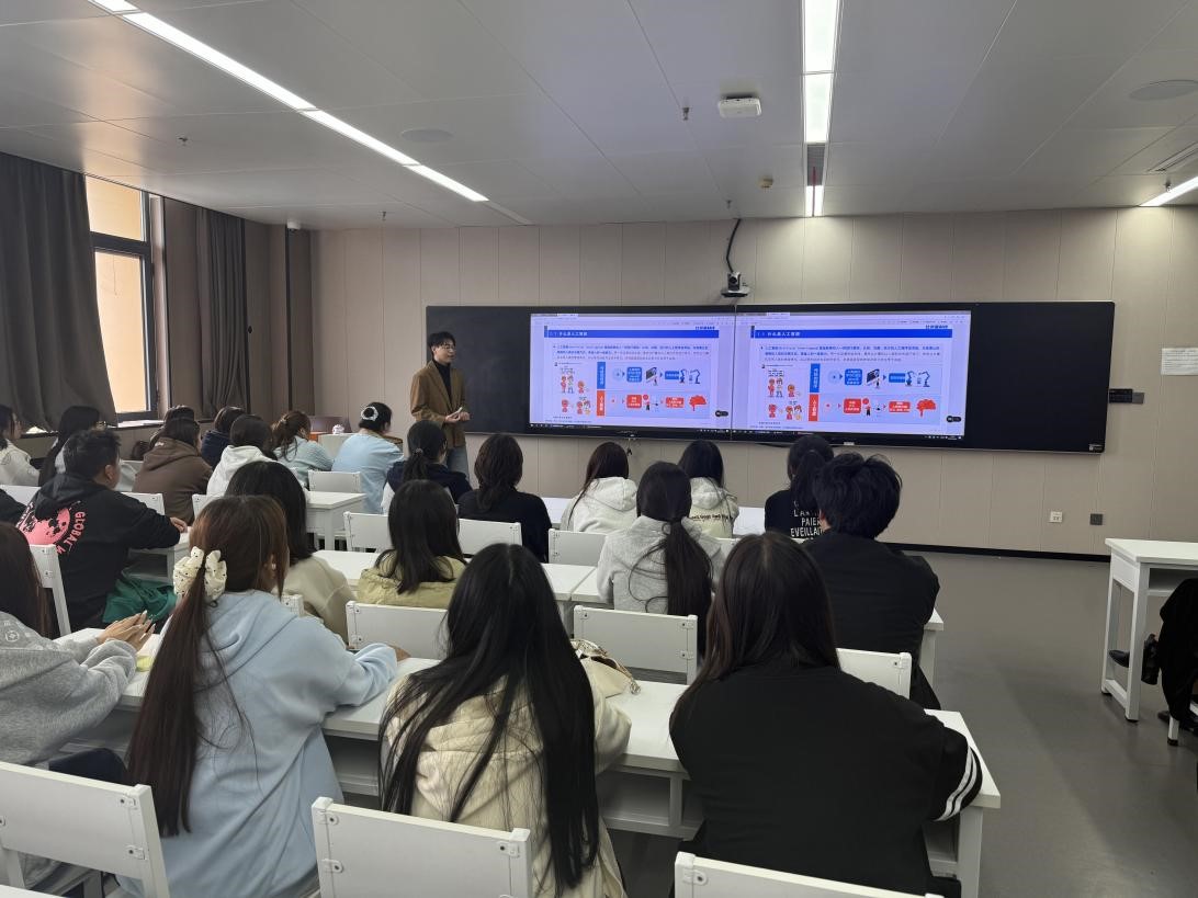 随后,活动特邀企业代表,湖南比邻星科技有限公司的方案工程师文懿崧,为新生们带来了一场内容翔实的专题讲座。讲座从人工智能的基本概念切入,逐步讲解了人工智能的核心能力与典型任务,进而深入介绍了人工智能技术在智能制造、智慧医疗、智能家居等多个前沿领域的广泛应用,并特别结合“智慧农业”等具体案例,生动展示了技术赋能传统产业升级的巨大潜力。讲座内容层层递进,案例丰富,为同学们提供了宝贵的行业视野与发展前瞻。
