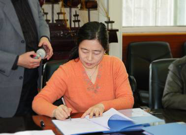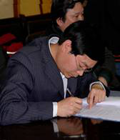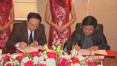 余卓民局长(右)和穆瑞杰院长(左)在校企合作协议上签字(2008-12-15)