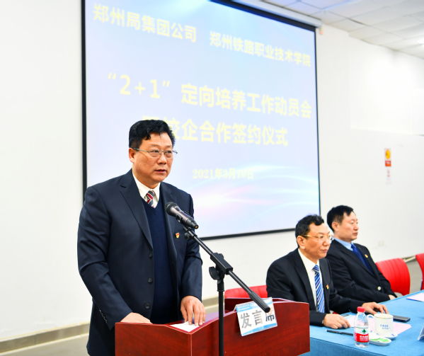 陆彦彬代表中国铁路郑州局集团有限公司对学校近年来取得的一系列成绩表示赞赏和祝贺。他表示,郑州铁院毕业生是集团公司新进人员的主要来源和宝贵的人力资源,推行高职毕业生“2+1”定向培养,从源头上把好了人员入口关,对于培养高技能人才队伍,提高技能人员素质,起到了重要作用。他从充分认识推行高职毕业生“2+1”定向培养的重要意义、抓住高职毕业生“2+1”定向培养的关键、落实“2+1”定向培养的相关责任三个方面对此次“2+1”定向培养工作提出了要求,希望将“2+1”定向培养打造为校企合作的典范,培养出更多高素质技术技能型人才。
