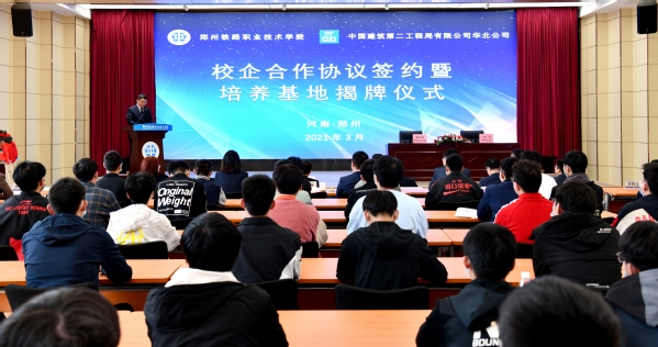伴随着热烈的掌声,党委副书记、校长孔凡士与中建二局总经理助理、华北公司党委书记、董事长陈广玉代表双方签署校企合作协议。在全场嘉宾的见证下,党委书记许琰与中建二局总经理助理、华北公司党委书记、董事长陈广玉共同为产教融合实训基地和人才培养基地揭牌。
