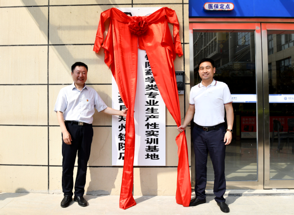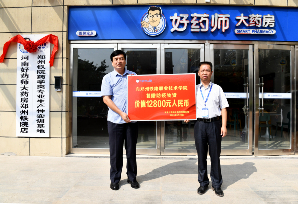 在全场嘉宾的见证下,学校党委副书记、校长孔凡士与河南九州通医药有限公司党委书记、总经理田超华共同为药学类专业生产实训基地暨好药师大药房郑州铁院店揭牌。