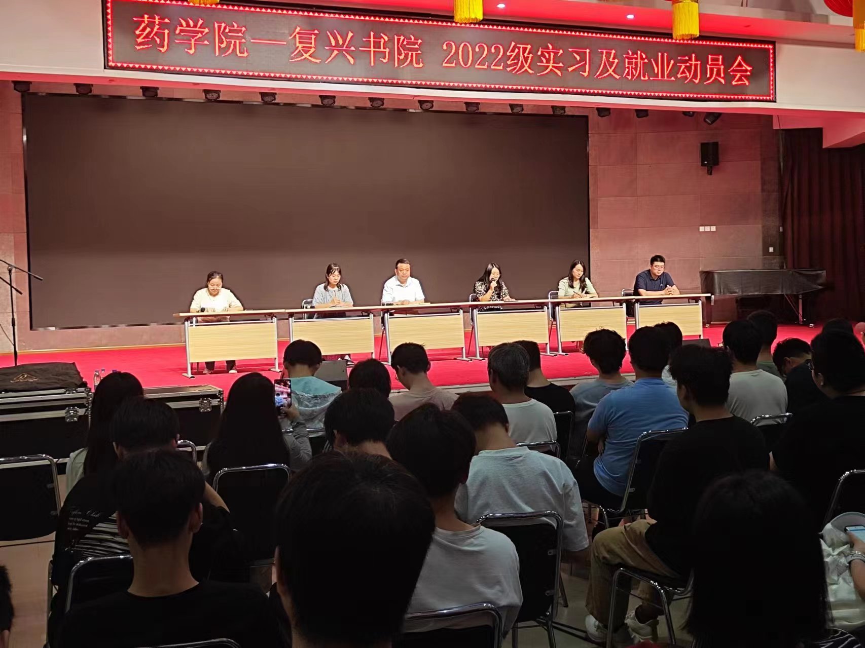 为进一步做好学生顶岗实习工作,指导学生做好顶岗实习前的各项准备,推进实习工作的顺利开展,同时引导学生树立正确的就业、择业观。612日,药学院-复兴书院在大学生活动中心召开2022级实习生动员大会。药学院院长张晓霞复兴书院党总支书记罗坤药学院复兴书院党总支副书记郭冬霞、教学科研办公室主任娄丽芳就业办公室主任李晋等参加了本次会议。会议由教学科研办公室主任娄丽芳主持。