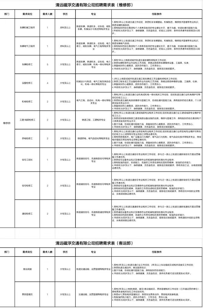 2、资料提交:应聘人员下载填写附件《清远磁浮交通有限公司招聘报名信息登记表》(点击文末链接进行下载)连同身份证、学历证、职称证、专业技术资格证等报名资料压缩打包后发送至电子邮箱qycf_zp@163.com;邮件名称请按“应聘岗位+姓名+专业”格式命名。