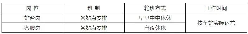 工作时间以轨道交通运营二分公司三车间的具体排班以及相关制度为准。本岗位有夜班,采用不固定轮休制。下表例举班制、轮班方式仅供参考。