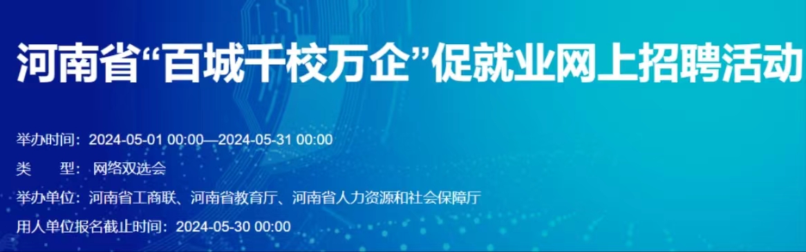 为促进2024年度“百城千校万企”促就业行动成效,我省同步也在河南省毕业生就业信息网开设招聘活动专区。