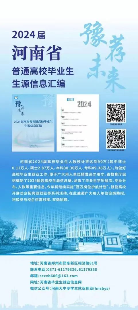 河南省教育厅发布了《豫荐未来——2024届河南省普通高校毕业生生源信息汇编》,涵盖我省2024年有毕业生的156所高校分专业、分层次、分生源地等统计情况。同时还公布了全省教育系统2024届高校毕业生就业双选活动计划及各高校就业部门联系方式,方便用人单位快速与全省高校建立沟通联系,统筹安排参加校园招聘活动,精准招录高校毕业生。