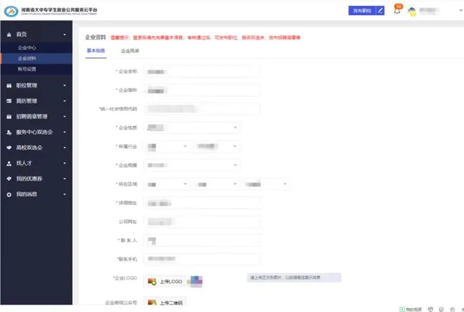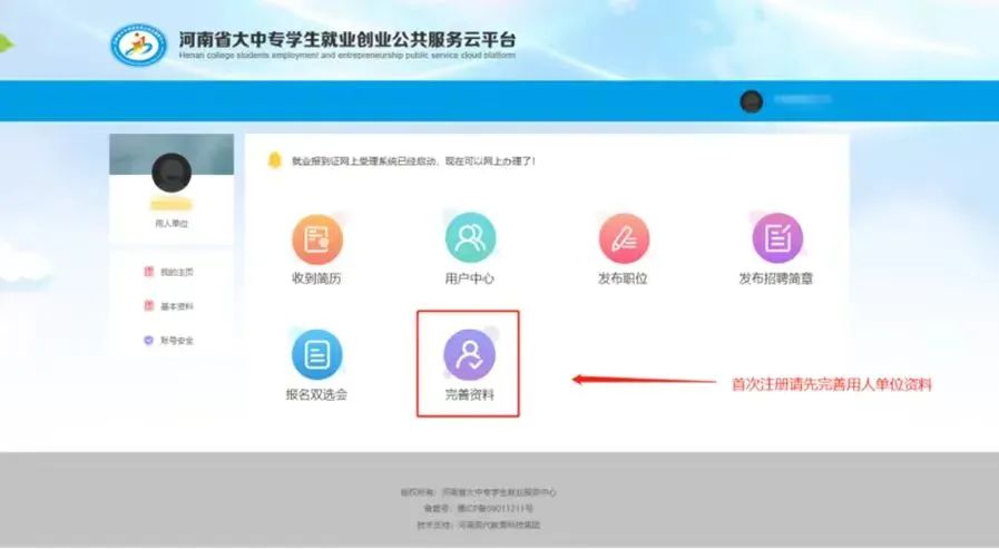 2.注册/登录成功后,点击完善资料,根据要求填报用人单位营业执照、组织机构代码等相关资料,并提交审核,后台工作人员审核成功后,可发布职位,报名参加双选会。(已注册过且完成资质审核的,可直报名参加)