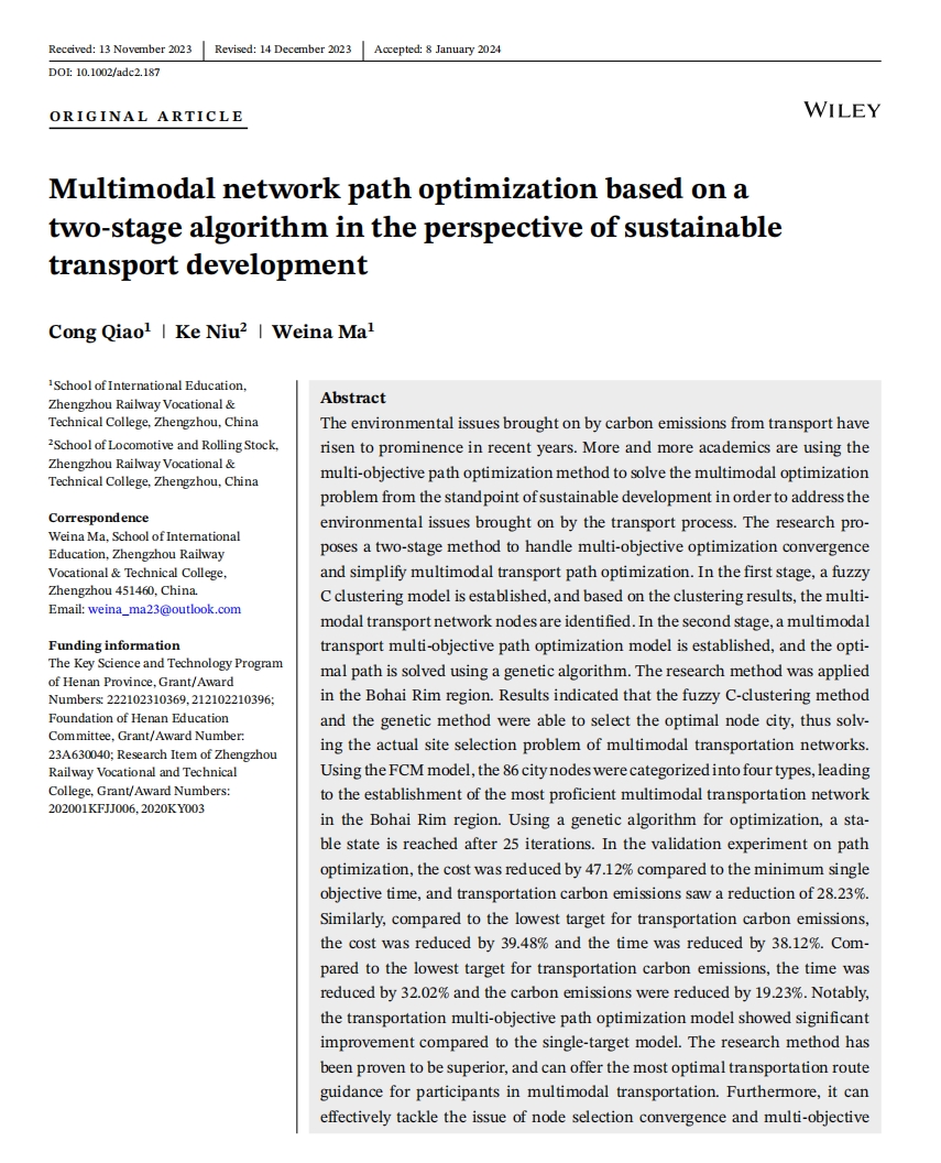 Reference: Qiao C, Niu K, Ma W. Multimodal network path optimization based on a two-stage algorithm in the perspective of sustainable transport development. Advanced Control for Applications: Engineering and Industrial Systems. 2024;e187. doi: 10.1002/adc2.187