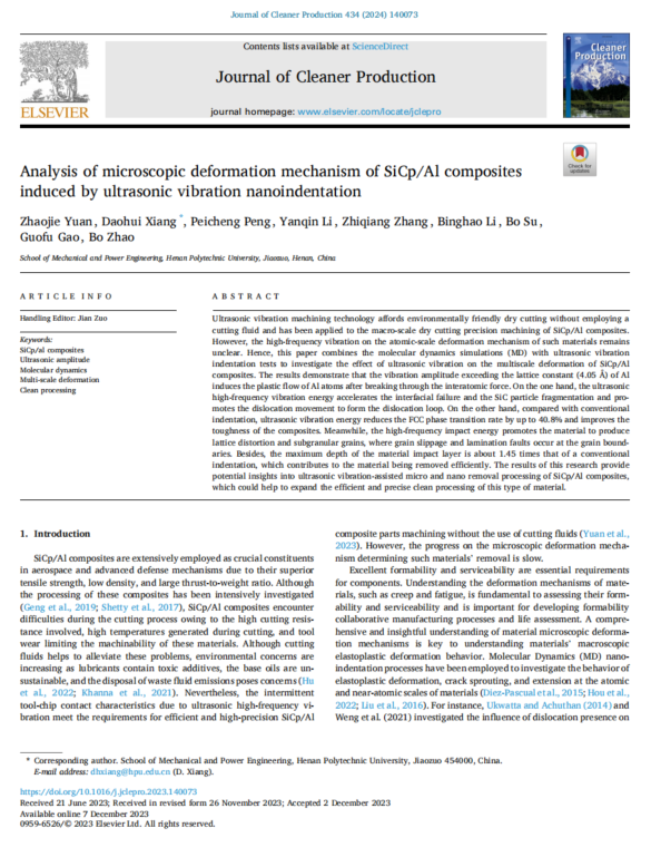 Yuan, Z., Xiang, D., Peng, P., Li, Y., Zhang, Z., Li, B., ... & Zhao, B. (2024). Analysis of microscopic deformation mechanism of SiCp/Al composites induced by ultrasonic vibration nanoindentation. Journal of Cleaner Production, 434, 140073.