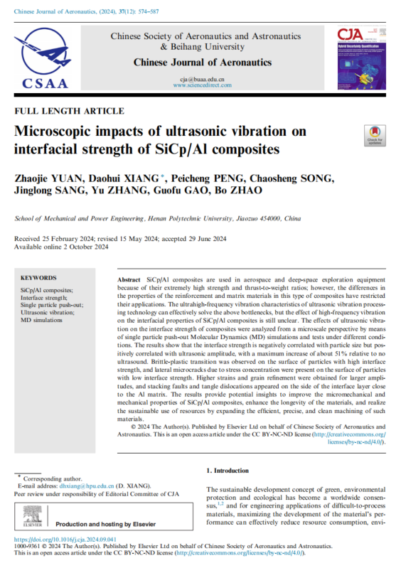 Zhaojie, Y. U. A. N., Xiang, D., Peicheng, P. E. N. G., Chaosheng, S. O. N. G., Jinglong, S. A. N. G., Zhang, Y., ... & Bo, Z. H. A. O. (2024). Microscopic impacts of ultrasonic vibration on interfacial strength of SiCp/Al composites. Chinese Journal of Aeronautics, 37(12), 574-587.