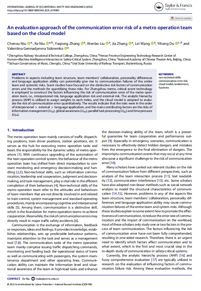 Niu, C., Niu, K., Zhang, Y., Liu, W., Zhang, J., Wang, L., ... & Sidorenko, V. G. (2025). An evaluation approach of the communication error risk of a metro operation team based on the cloud model. International Journal of Occupational Safety and Ergonomics, 1-13.