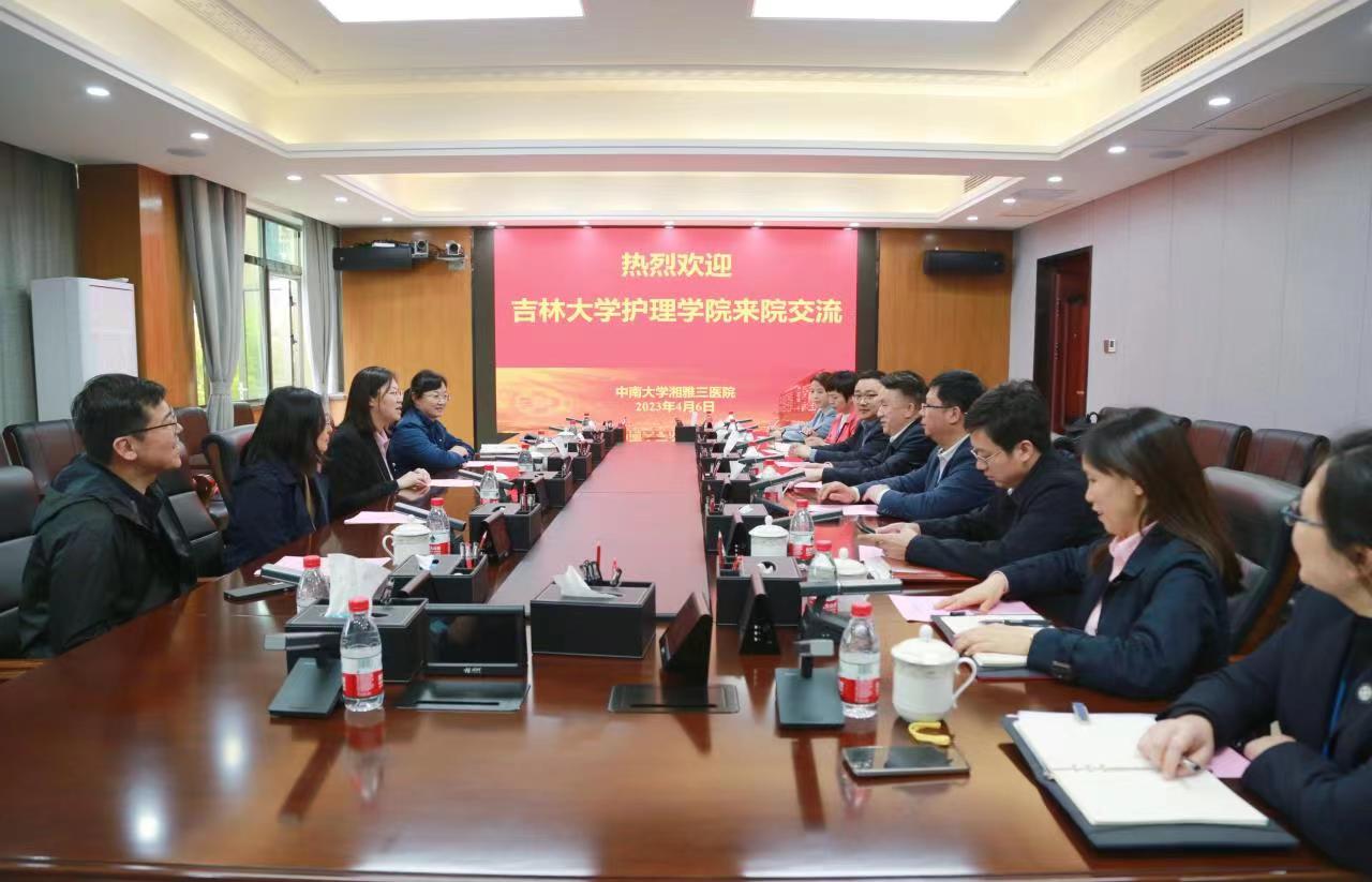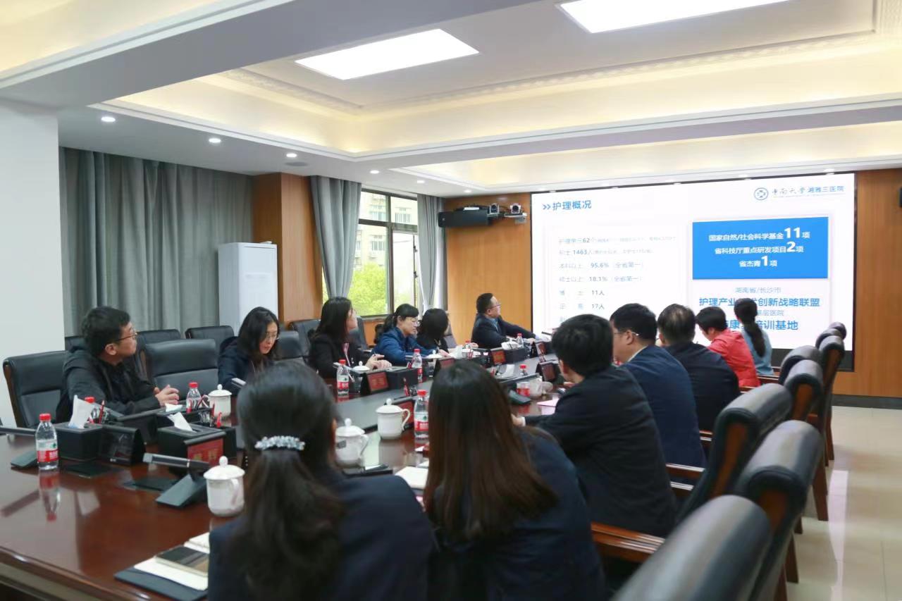 4月6日下午,350vip浦京集团官网党委书记韩月波、副院长李昆等一行5人前往中南大学湘雅三医院进行调研交流。中南大学湘雅三医院党委书记何庆南、党委副书记杨飞龙、副院长曹科、党委办公室主任许泽华、护理部主任严谨、护理教研室主任毛平等参加调研座谈会。杨飞龙副书记主持会议。